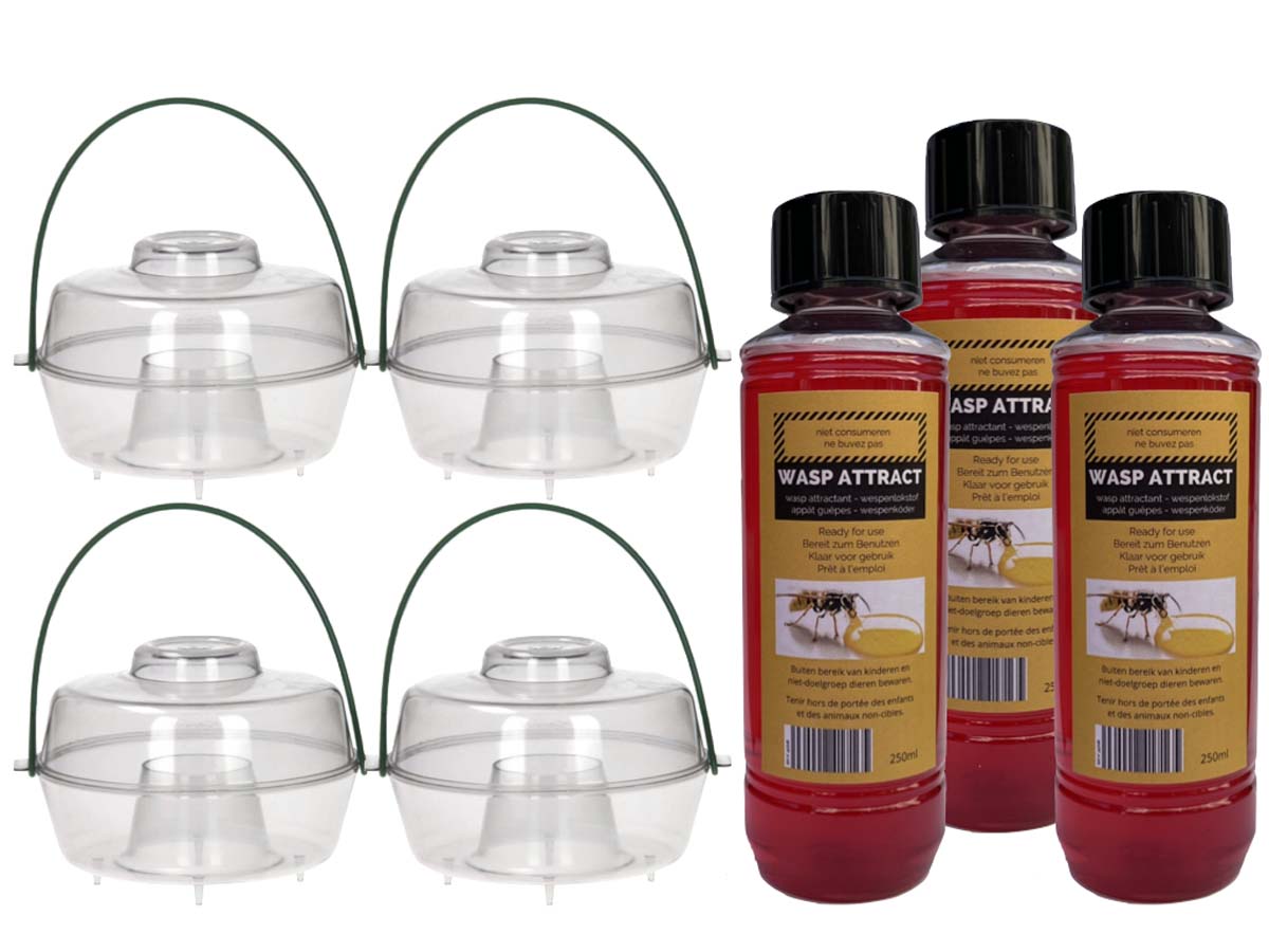 Bestrijd wespen effectief met de Wesp SET. De set bevat 4 wespenvallen en 3 flessen Wasp Attract wespenlokstof van 250 ml. Bestel nu!